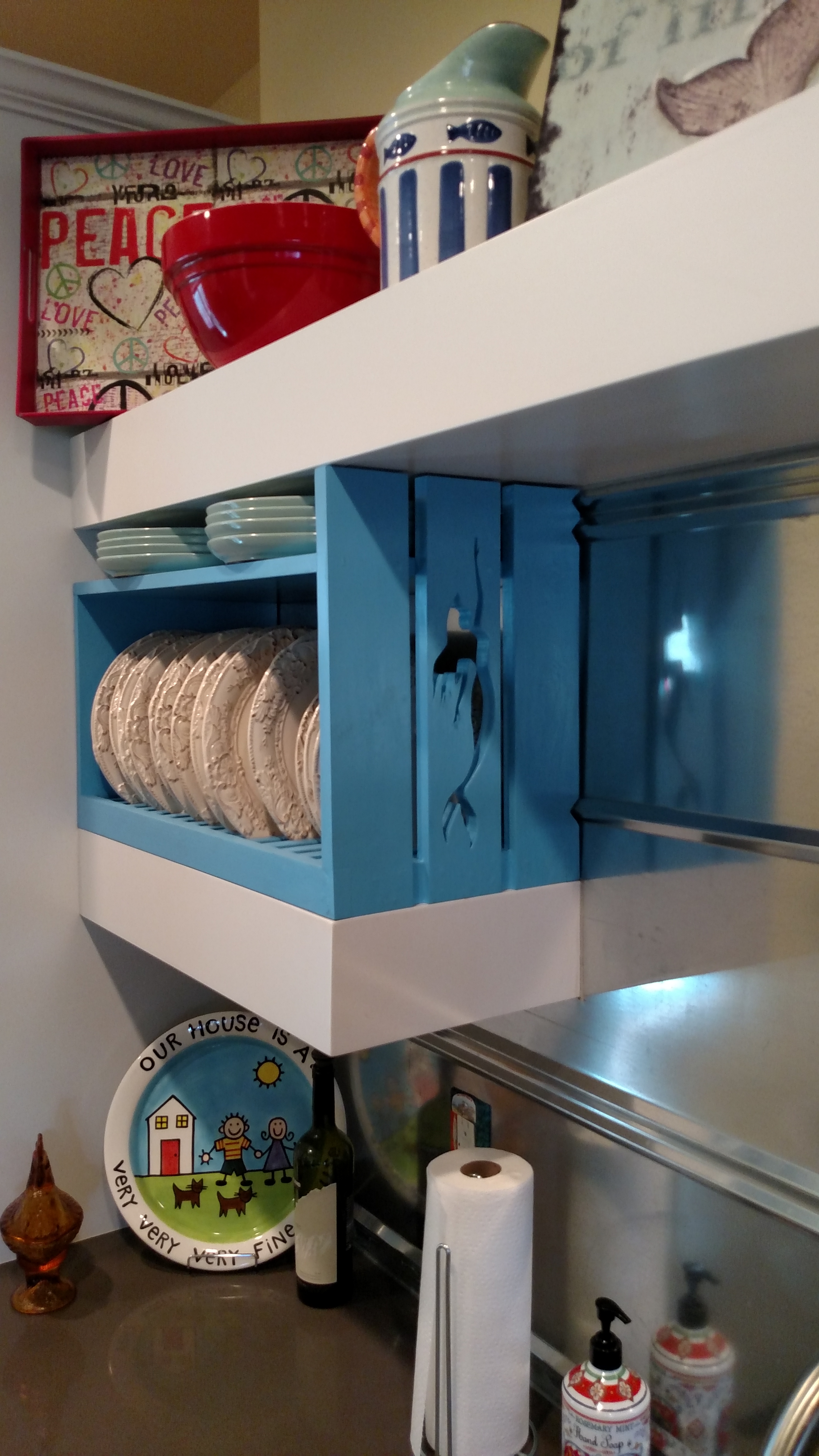 Mermaid House, Calabash 6\"round heartpine dining table wrapped in metal with cedar base!! 8 foot long wood burned coffee table!! Stained glass for light Mermaid Porch swing Mermaid mailbox Mermaid shutters under construction Hand-carved oars and buoys Custom bar front Heart-pine-bar-and-stools-1 Outside shower Wood burned sign Antique door coat rack Inside shutters Upstairs window shutters Oak Stairs with Metal Risers Metal Mermaid on Heart Pine Slats Mantel and custom frame Metal-fireplace-trim-with-Heart-pine-mantel Heartpine frame seaglass mermaid Sea-glass-Mermaid-shutters Custom frame and sea glass shutters Wood-and-metal-frame Old tin wainscot for the bathrooms!! Mermaid lamp on a sand dollar base!! Mermaid dish rack!! Mermaid wine glasses custom etched!! Door and window mermaids